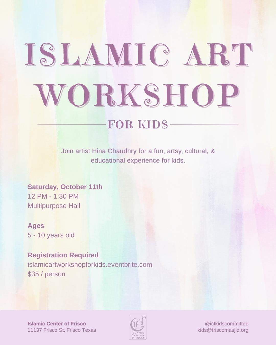 Let your little one channel their inner Da Vinci! This Saturday, the Islamic Center of Frisco is hosting an Islamic Art Workshop just for kids. Artist Hina Chaudhry will lead a fun, educational session where children ages 5-10 can get hands-on with cultural and creative arts. Itโs the perfect way for them to make beautiful art and beautiful memories!