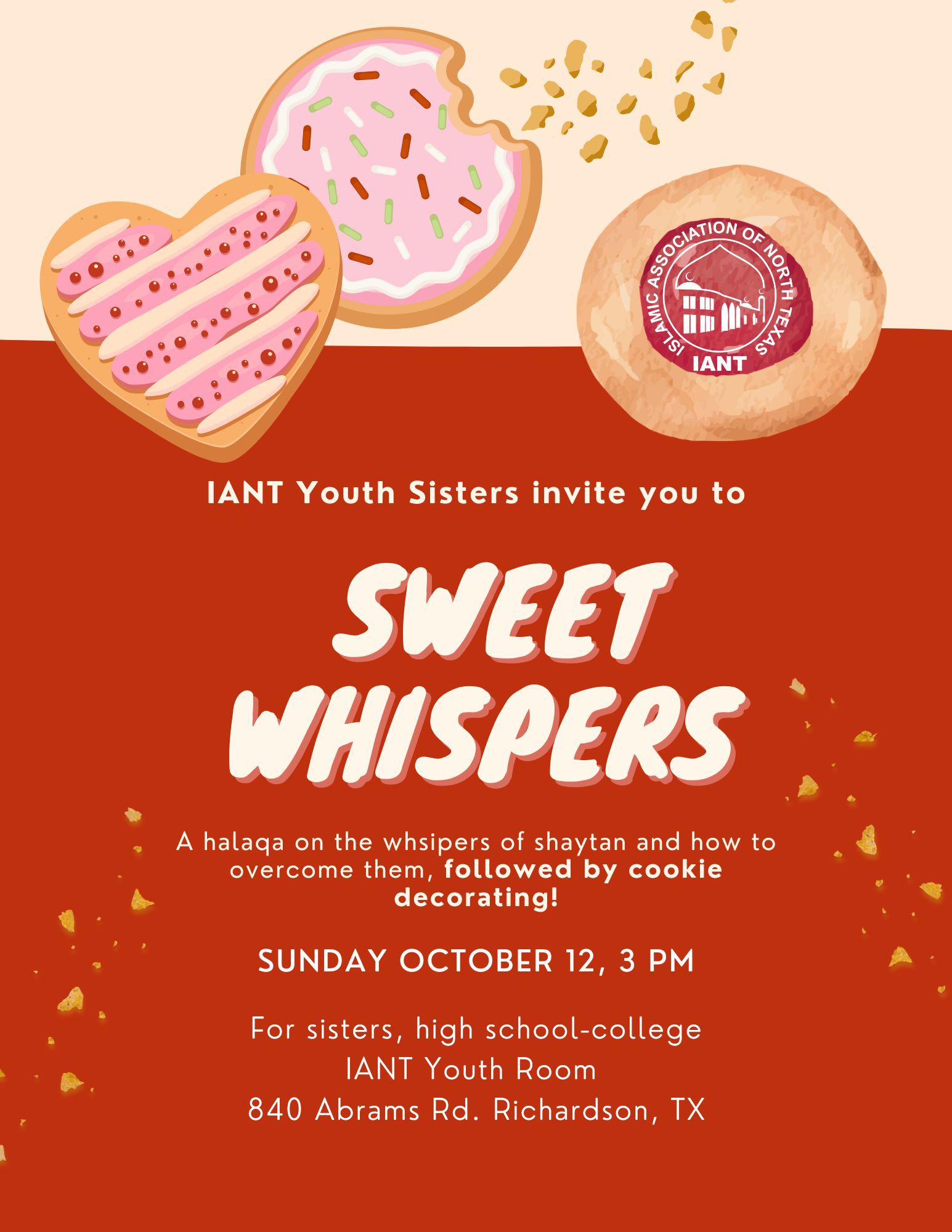Ready to sweeten your soul and your cookies? The IANT Youth Sisters invite high school and college sisters to "Sweet Whispers," a halaqa focused on overcoming the whispers of shaytan! After the spiritual boost, connect with your sisters over some fun, creative cookie decorating. It's the perfect mix of learning and socializing!