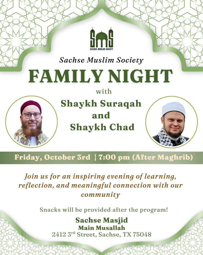 Looking for an inspiring, meaningful way to kick off your weekend? The Sachse Muslim Society is hosting a special Family Night tonight! Join renowned scholars Shaykh Suraqah and Shaykh Chad for an uplifting evening of learning and reflection. Bring the whole family for connection, community, and best of all, snacks provided after the program.
