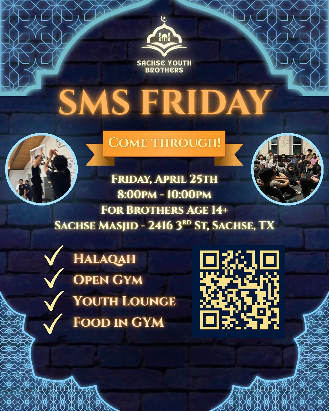 Sachse brothers, your Friday night plans just got a serious upgrade! Why stay home when you can hit the masjid for a perfect mix of food, fitness, and faith? We’re kicking things off with a halaqah to feed the soul, followed by open gym and youth lounge vibes to burn off all that gym food.